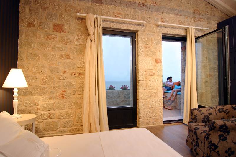 The upper floor has two more bedrooms. One is with twin beds (2X90cm wide) and shower room. The other one is with a double bed, a further shower room and access to the upper terrace with panoramic views. Both include a TV and air conditioning.